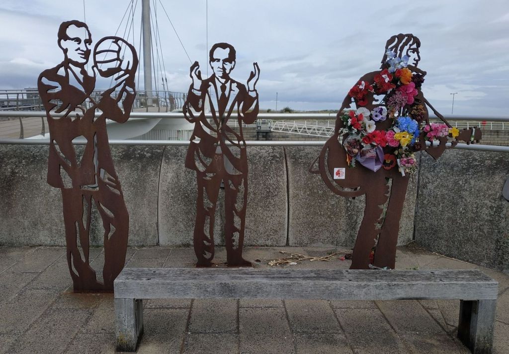 A common feature of Sustrans routes are rusted steel silhouettes of local heros. On the outskirts of Conwy as well as Rhyl footballer from the 1940s and a climate change expert, this one included Mike Peters from the Alarm who had died recently.
