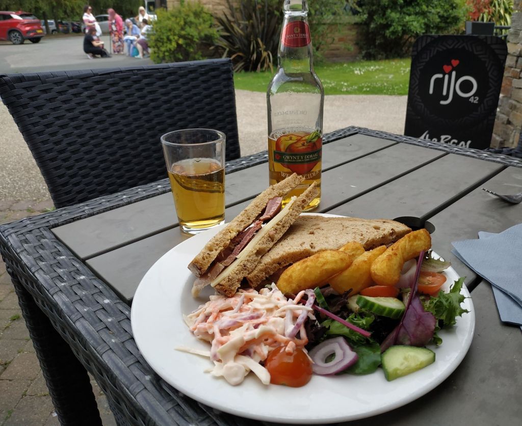 Rejoining the A548 on formal and informal cycleways just before Mostyn, I realised that I hadn’t had any lunch, so was pleased to find a café at a country store. As well as celebrating the significant completion of the ride with a cider, I was also able to negotiate 4 chips in place of the crisps offered with my sandwich in response to a 36-year long New Year’s resolution.