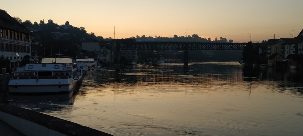 It’s always nice leaving early when there’s no traffic, no noise and a light mist hanging over the Rhine in Switzerland. A great chance to knock off some of the 100 miles, like approaching a big run chase at cricket.