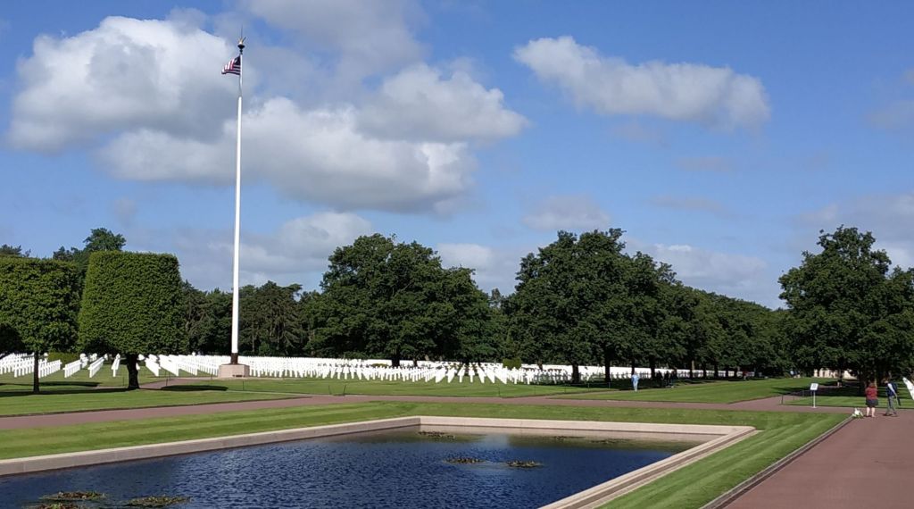 It was simple, head down into Grandcamps Maisy and then follow the coast. Even better there was a tailwind, but a bit chilly despite the sun. The miles flew past and soon I was at Omaha beach, the site of the US landings on 6 June 1944. After visiting the main monument on the coast I then cycled up to the Normandy American Cemetery, an immaculate and peaceful place only interrupted by a choir singing the Star Spangled Banner at 10:30am. On a purely practical note, it must take a huge team (I want to say ‘army’, but feel that’s not appropriate) of nocturnal gardeners to keep it looking so nice.