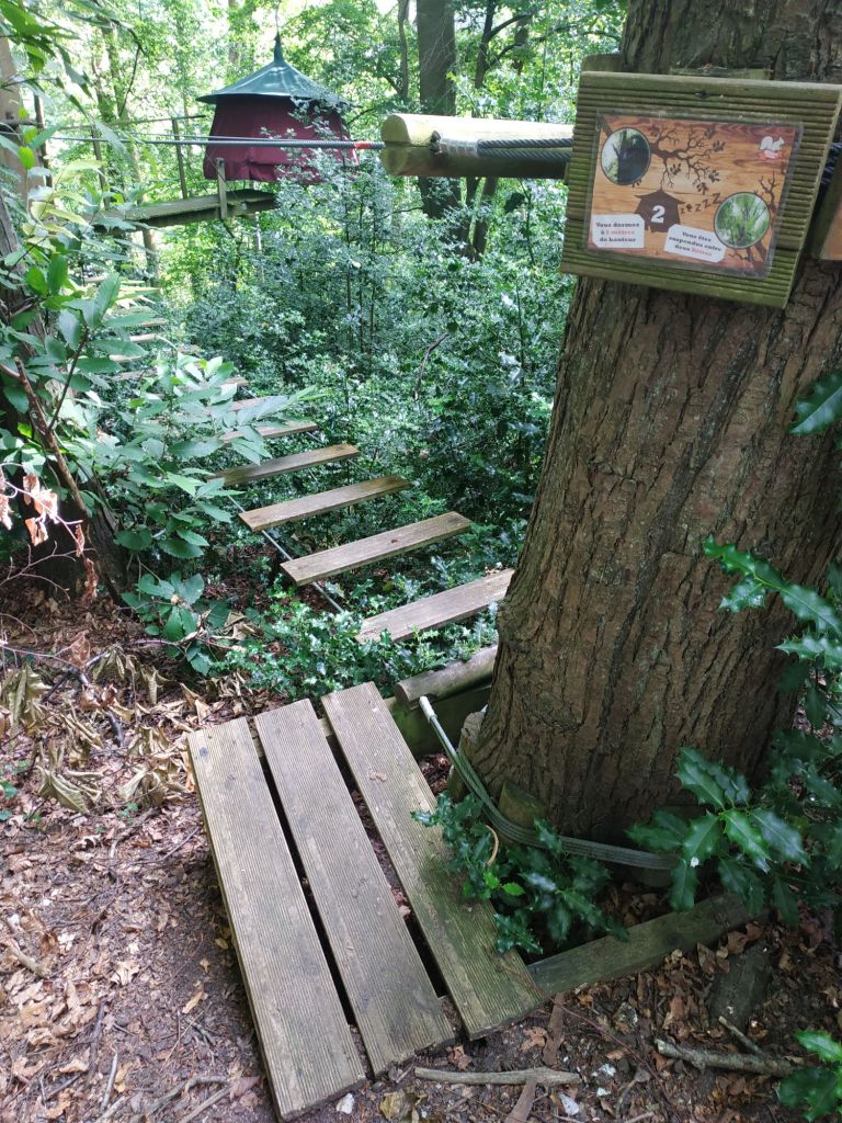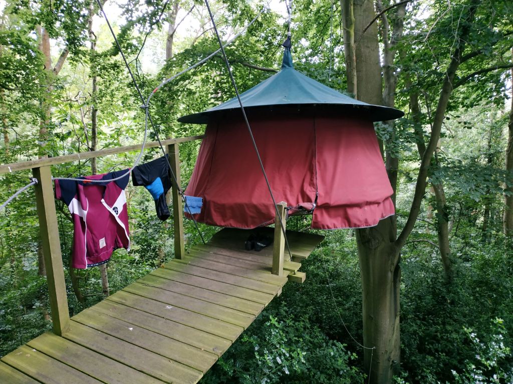 So, after this unexpected and unproductive stop, I had to ‘put the hammer down’ (as best as I could) and got to Woody Park by 5:50, in advance of check-in closing at 6:00pm. I had booked ‘une tente suspendu’. On arrival, l was promptly given a harness, shown how to put it on and how to get into a demonstration tent safely using carribinas. I then had to wander round the park and select my own tent. While it looked interesting and different it was probably at the lower end of my low expectations for glamping and very pleased that I had not persuaded Cissy to join me.