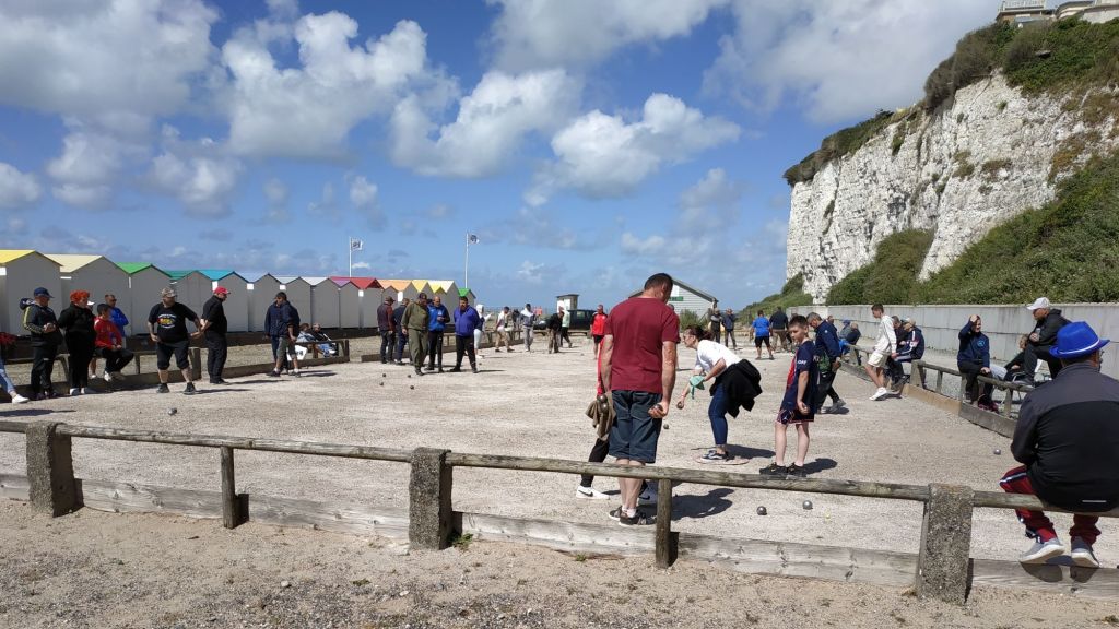 Wondering why it always seems so quiet at weekends, I found out how some of the French spend their Saturday afternoons, playing a petenque league match on the seafront at Criel-sur-Mer. Noticed that they all have a small hoop in which to place their foot before throwing.