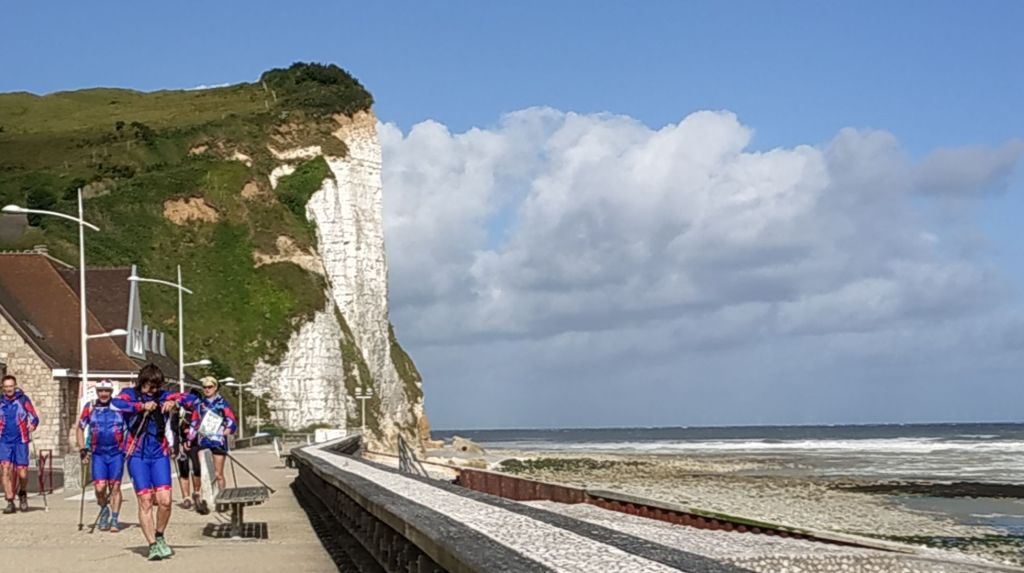 Not great preparation for a long cycle, but at least l could get an early start @6:45 after the rain had stopped. The first target of the day was Dieppe at 45 miles. The coastal(ish) route varied from undulating to hilly. It was also quite chilly but at least I had a strong tailwind as I descended down to and ascended out of a few ‘……-sur-Mers’. It was interesting to note that the walking clubs have their own club kit.