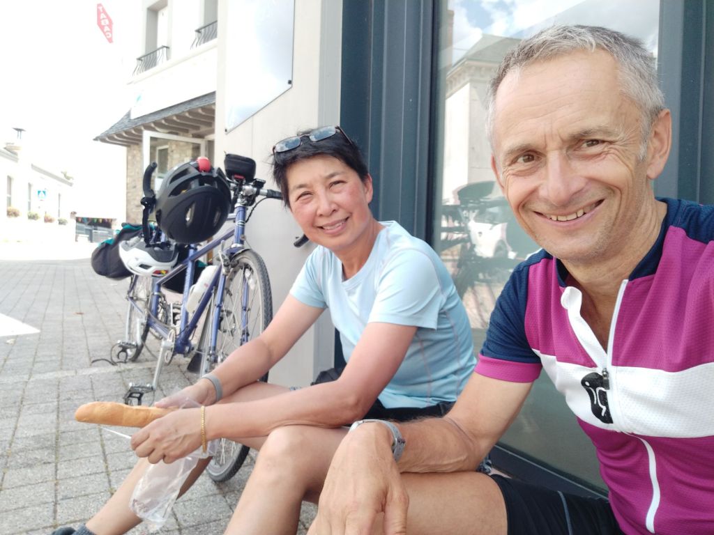 We left our idyllic overnight accommodation @ 9:30am and followed the back wheel of our hosts up to Guer for coffee and a supermarket lunch stop. It was another undulating day, albeit on more well-surfaced and quiet, but hot, roads. After a parting of the ways, we continued up to Maximet for a self-made lunch supplemented with a refreshing coke from a bar.