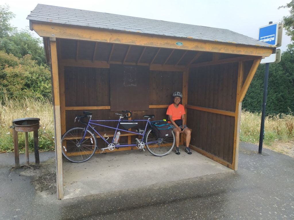 After Becherel, Google directed us on quieter, but rolling roads (anything other than flat roads is always much harder on a tandem). Thankfully it was cooler today at 24 degrees. After a stopping for self-made sardines and humus baguettes in Mesnil-Roc’h the wind increased and sunny intervals gave way to grey skies. Rain was in the air and duly arrived 2pm, necessitating a brief stop in a suitably sized bus shelter.